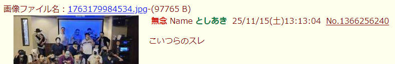 | … | 7無念Nameとしあき25/11/15(土)17:25:35No.1366305656そうだねx6よくこんなわけのわからん集まりの写真に発狂できるな |
