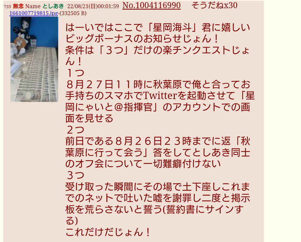 | … | 75無念Nameとしあき25/11/15(土)17:54:38No.1366312218そうだねx8 1763196878913.jpg-(738259 B) >星岡海斗はどのように粘着されてたの? |
