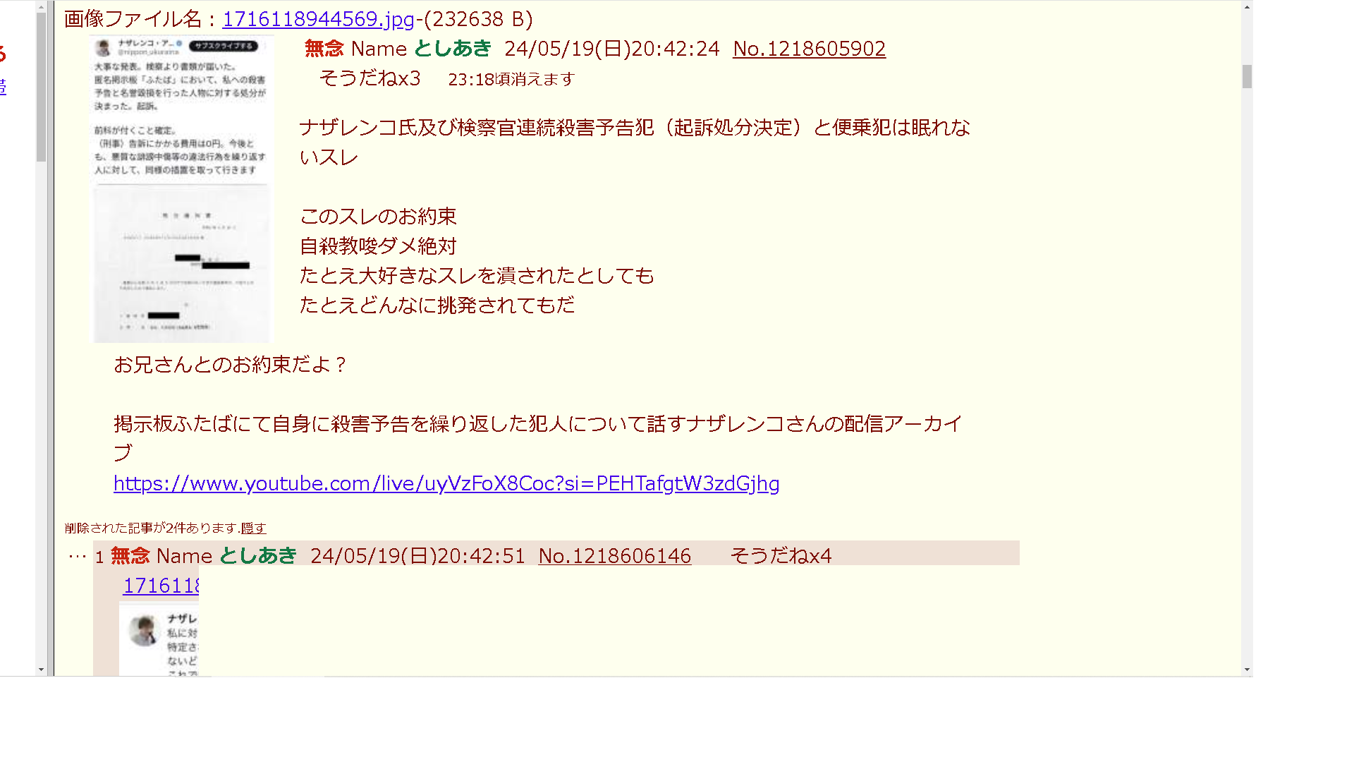 | … | 233無念Nameとしあき25/11/15(土)18:52:33No.1366327633そうだねx5>今ちょうどニュースでネット荒らしの開示請求特集やってるよ |