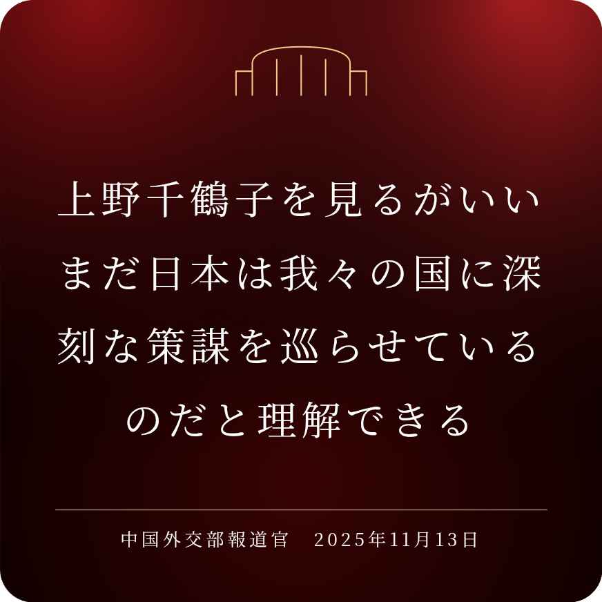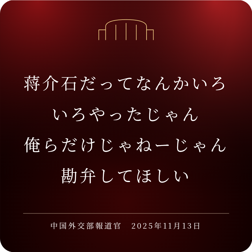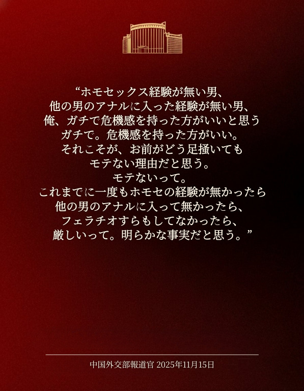 | … | 165無念Nameとしあき25/11/15(土)19:04:27No.1366331139そうだねx5中国外交部はメンツが潰れたみたいな態度とってるけど |