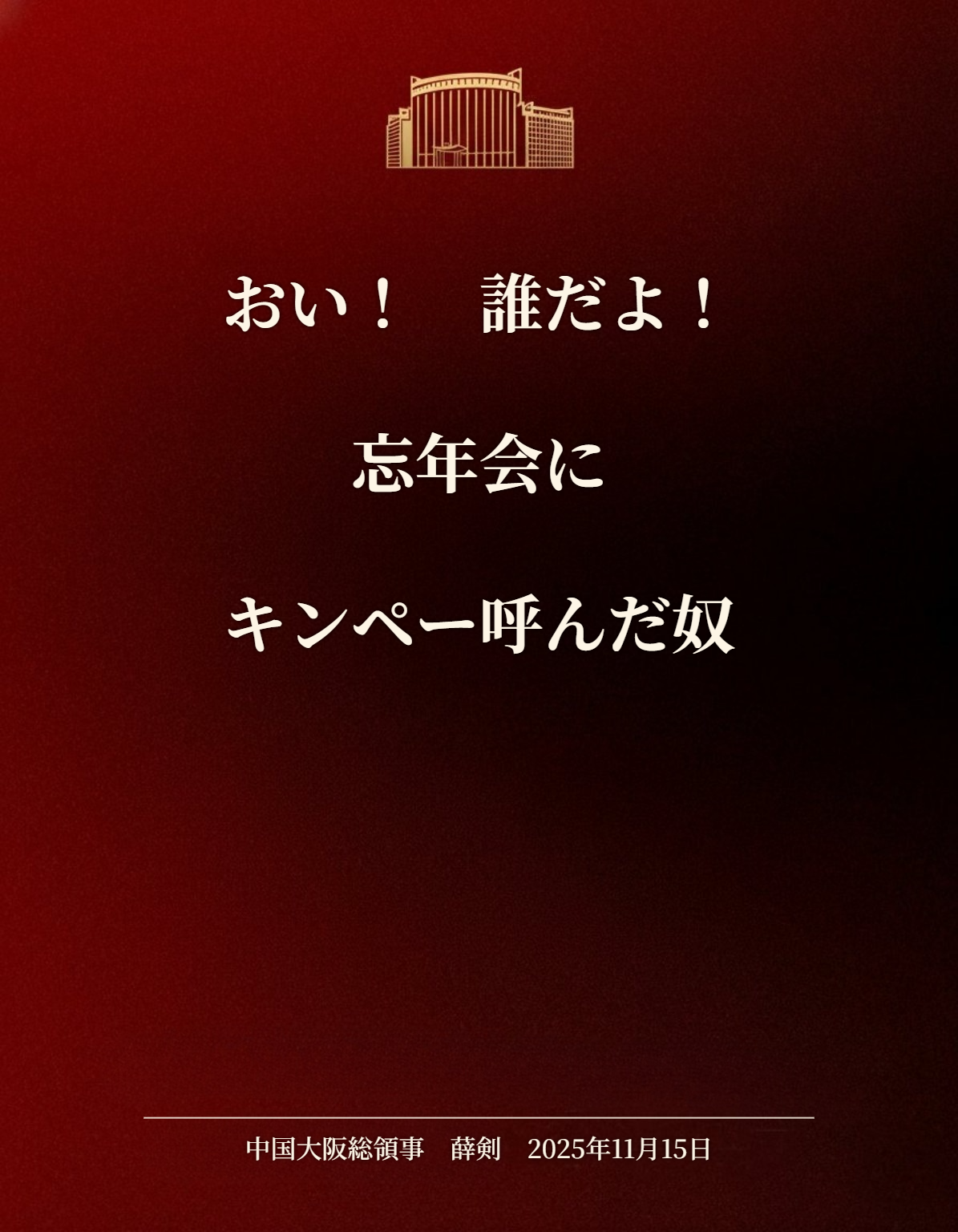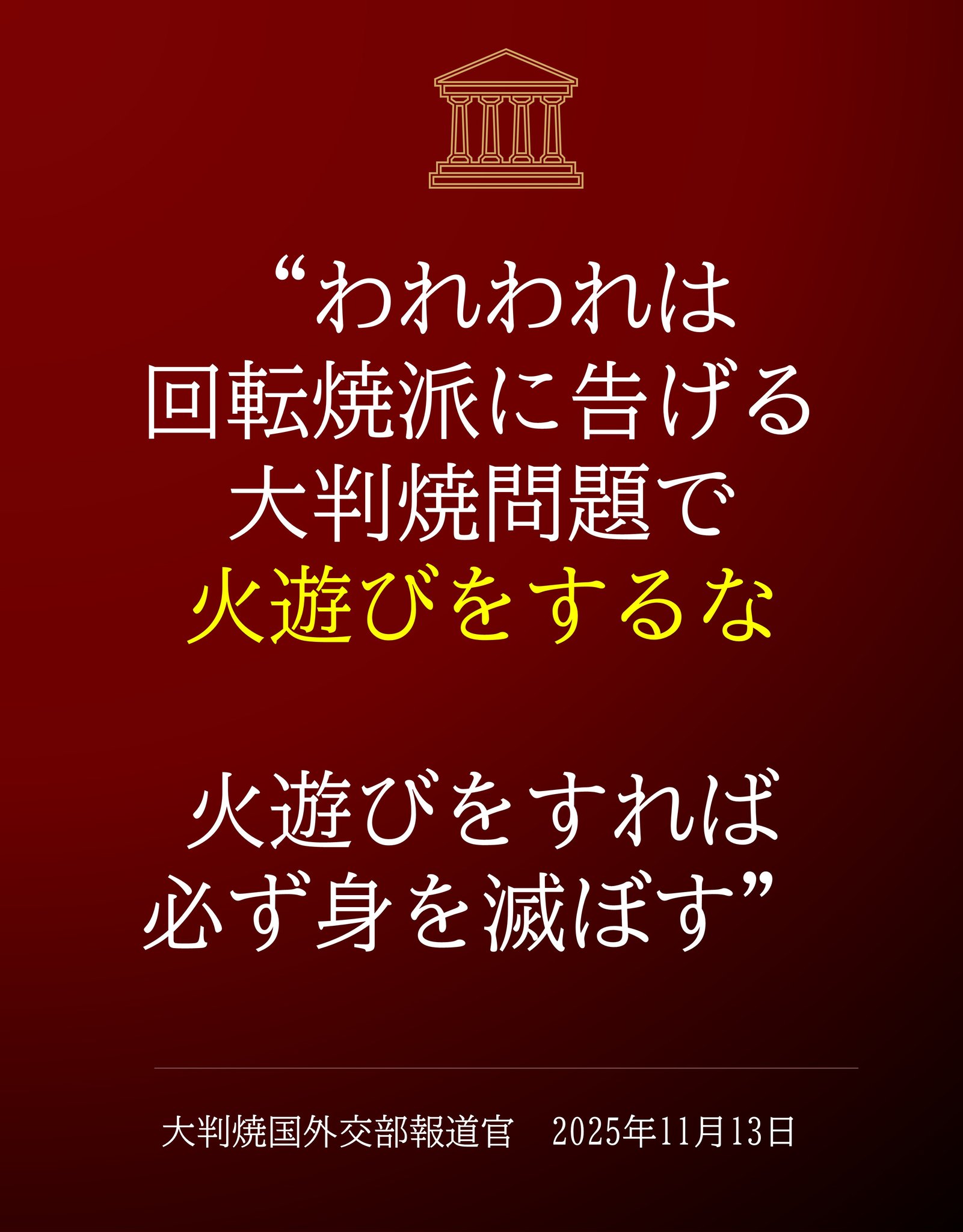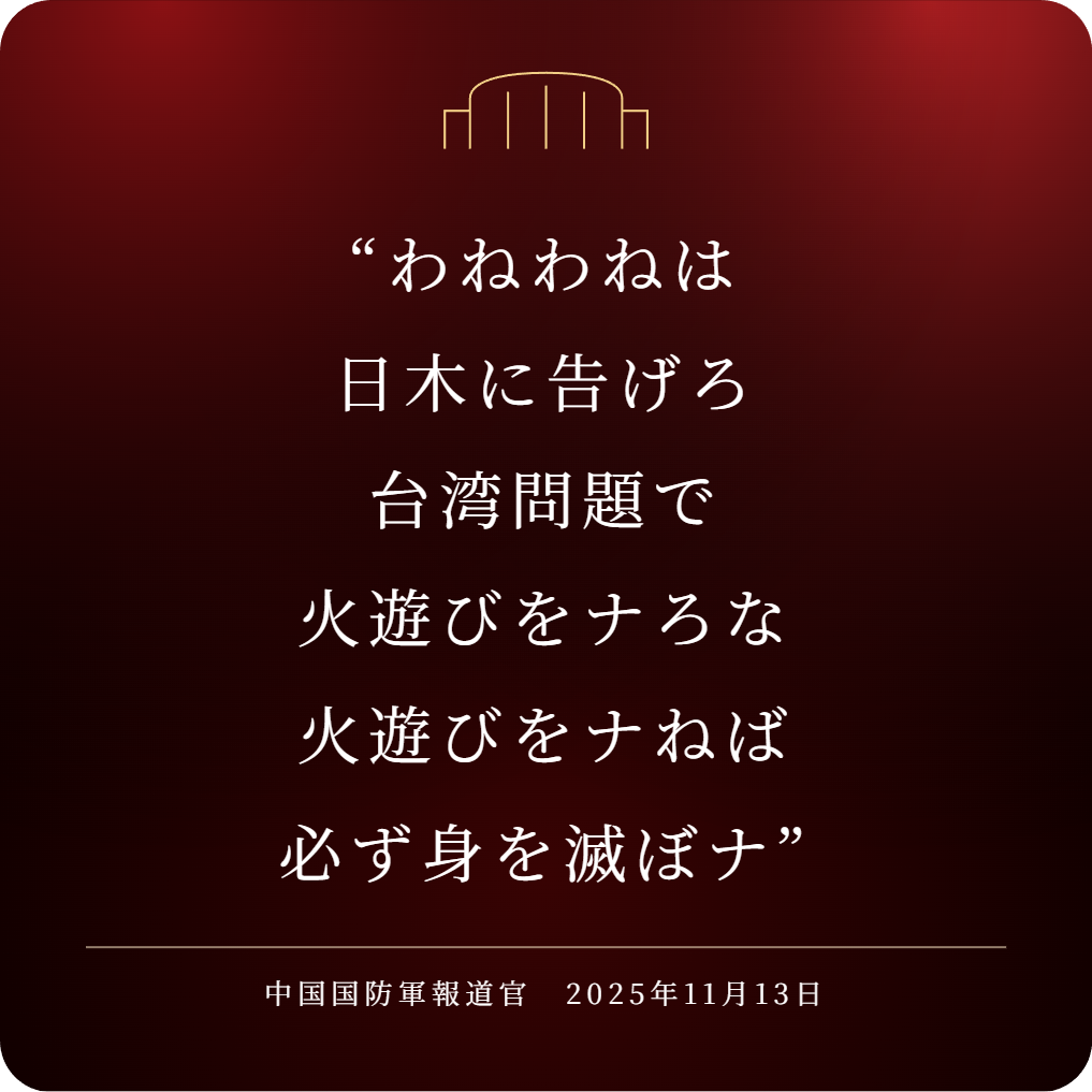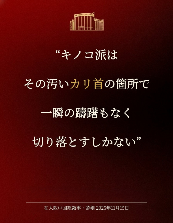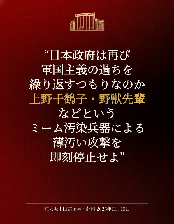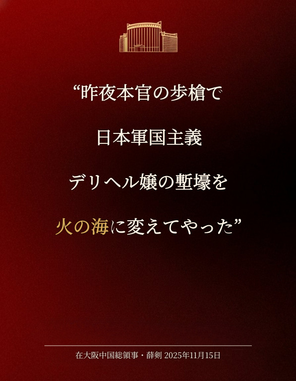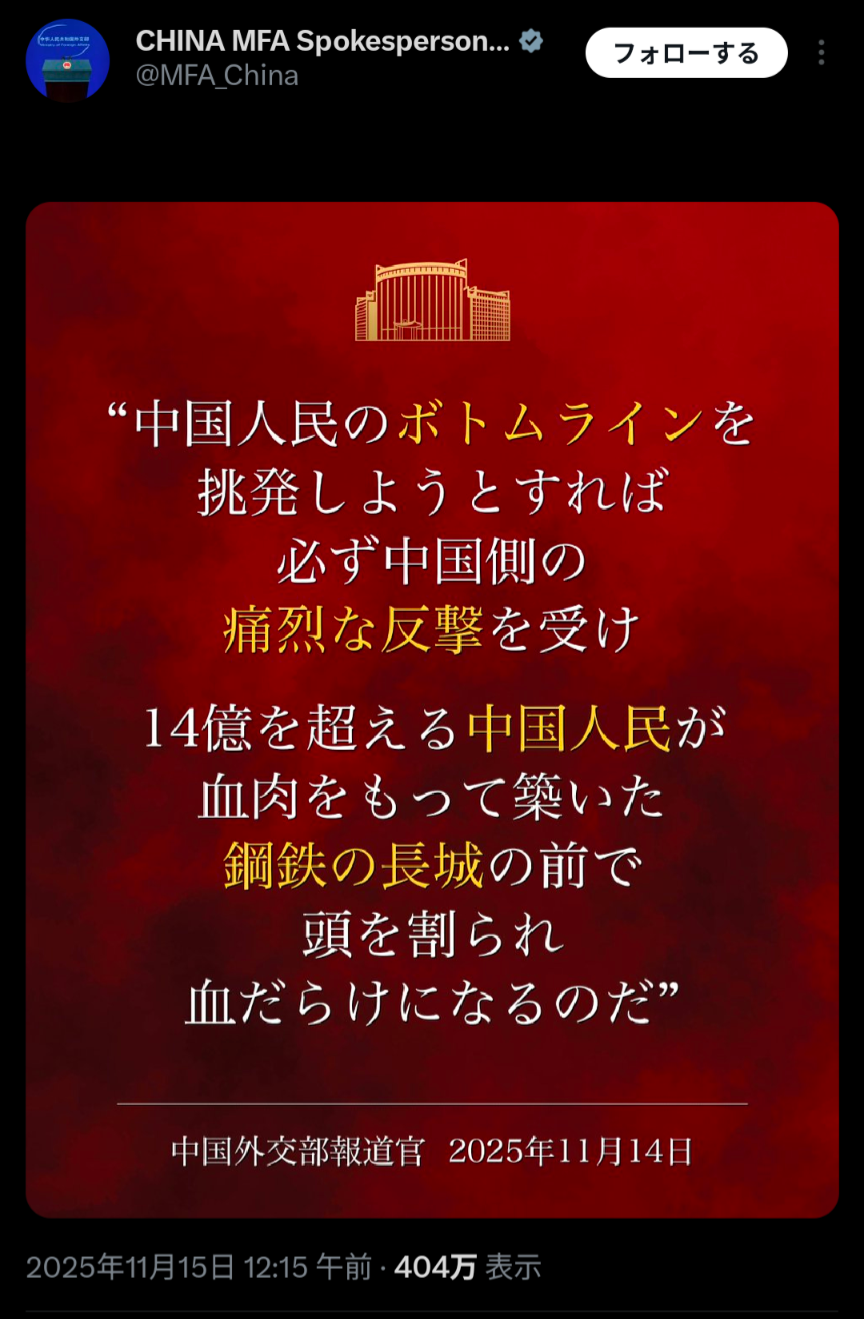 | … | 95無念Nameとしあき25/11/15(土)18:25:18No.1366320063+中国共産党「台湾に手を出すな!身を亡ぼすぞ!」 |