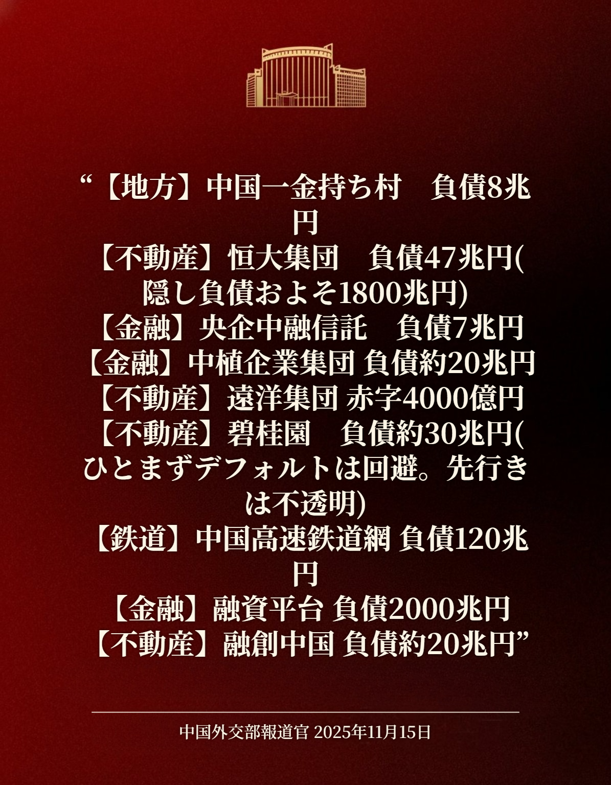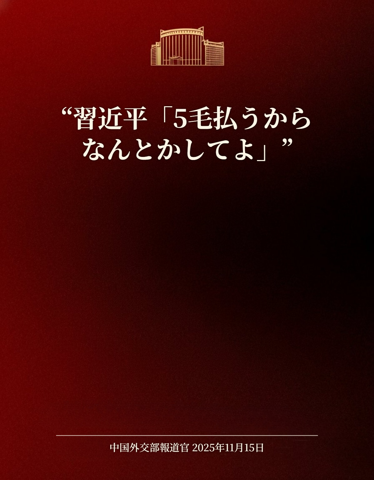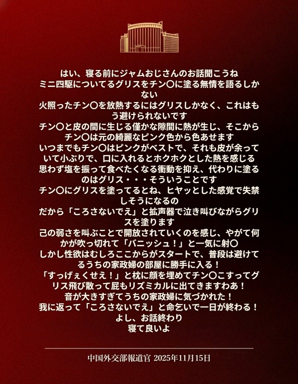 | … | 86無念Nameとしあき25/11/15(土)18:22:38No.1366319311+>中国外交部の公式アカウントにリプでずらっと並んでるから |