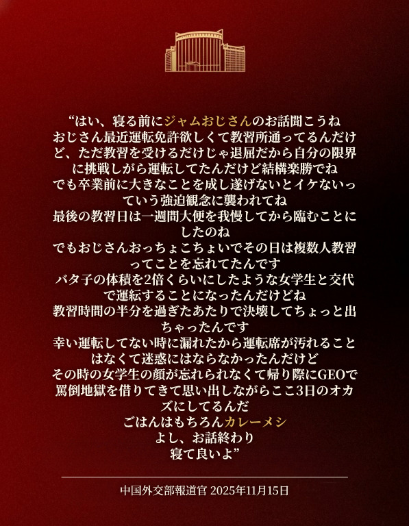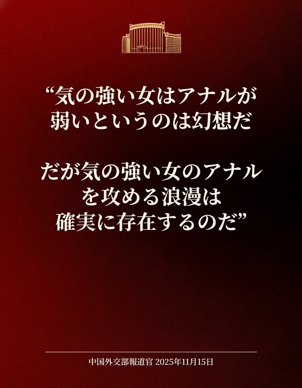 | … | 71無念Nameとしあき25/11/15(土)18:16:29No.1366317737+>日本の中国外交部って自分達の仕事がこんな弄られかたされて耐えれるのだろうか |