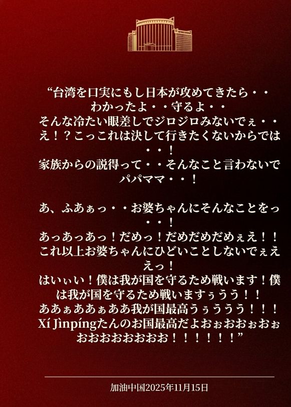 | … | 48無念Nameとしあき25/11/15(土)18:04:37No.1366314696+>これを北京語で出せばいいんだな |