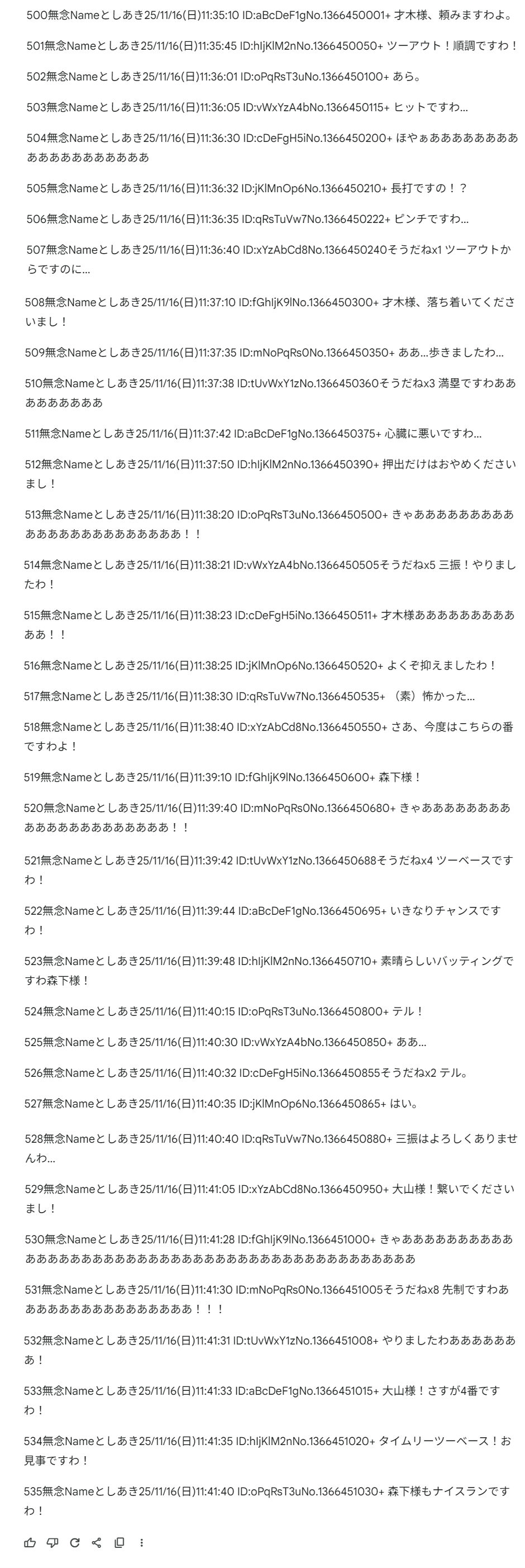 | … | 270無念Nameとしあき25/11/16(日)11:43:30No.1366501873+>適当にGemを作って架空の試合をAIに実況させましたわ |