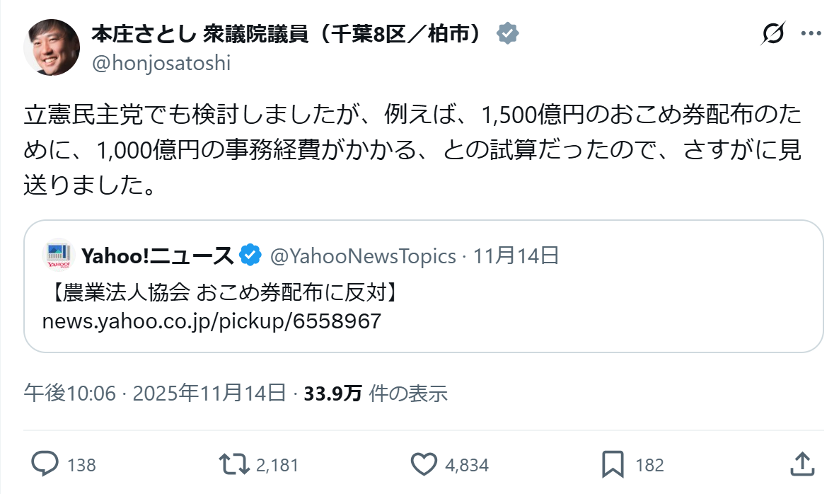 | … | 351無念Nameとしあき25/11/16(日)16:18:32No.1366558488+>立憲民主党でも検討しましたが、例えば、1,500億円のおこめ券配布のために、1,000億円の事務経費がかかる、との試算だったので、さすがに見送りました。 |
