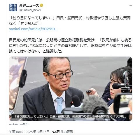 | … | 37無念Nameとしあき25/11/18(火)17:16:47No.1367006850そうだねx1何とか石破のせいにしよう |