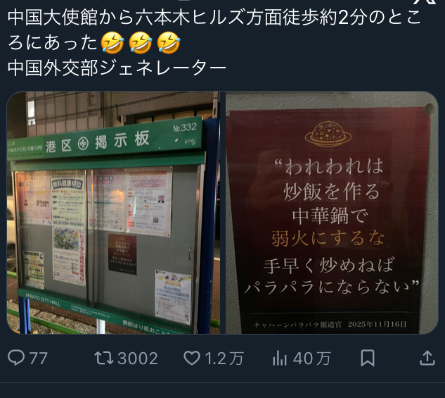 | … | 988無念Nameとしあき25/11/18(火)18:31:31No.1367021415そうだねx4>中国人『もう終わりだよこの国』 |