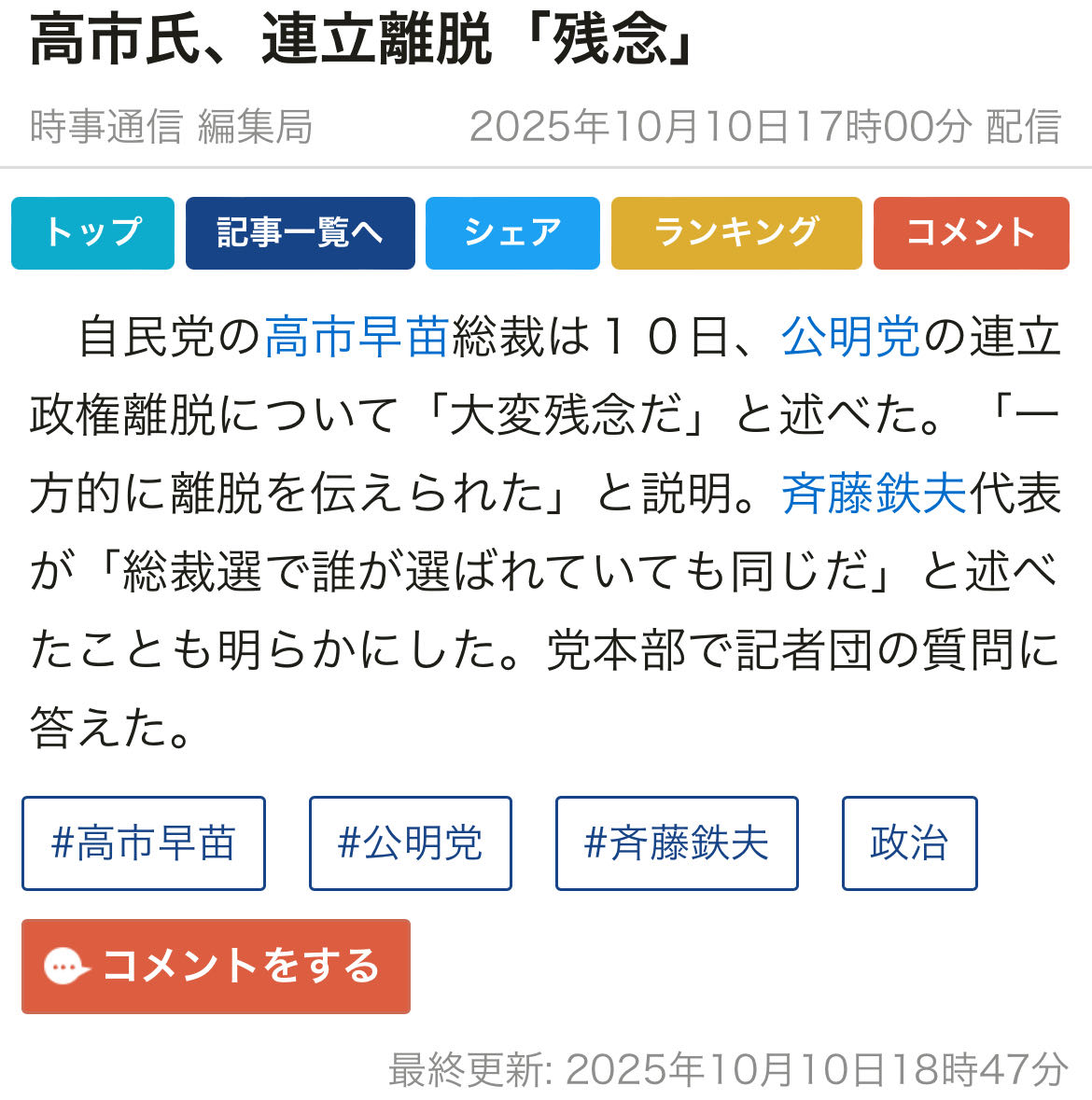 | … | 8無念Nameとしあき25/11/18(火)20:31:25No.1367052767そうだねx10公明と連立してたならもう総理は謝罪してたろうな |