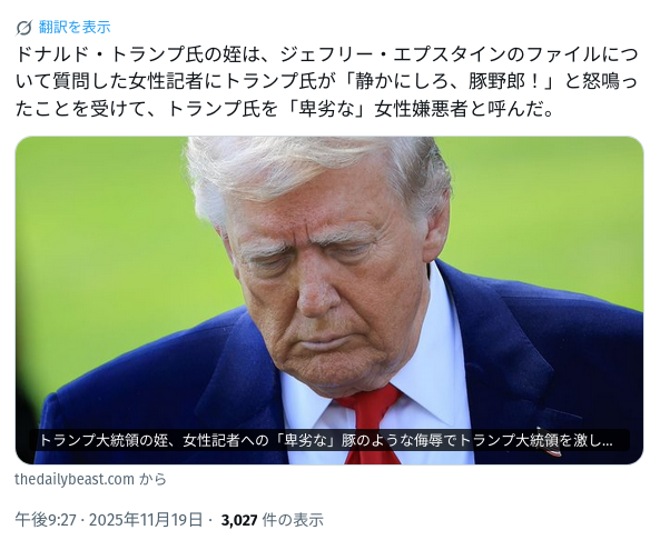 トランプおやびん、姪っ子から「ガチで女を憎んでる奴だ」と言われてしまう
