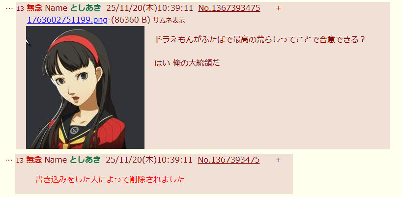 | … | 23無念Nameとしあき25/11/20(木)10:43:18No.1367394036+>何で消したの? |