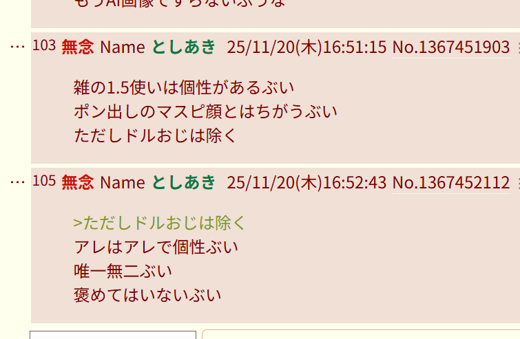 | … | 142無念Nameとしあき25/11/20(木)17:08:13No.1367454448+>こんな時に限って削除に敏感な無能な働き者なスレあきじゃないぶう |