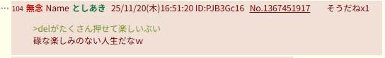 | … | 163無念Nameとしあき25/11/20(木)17:17:12No.1367455874+>>あいつは自分への暴言しか消さない無能なので |
