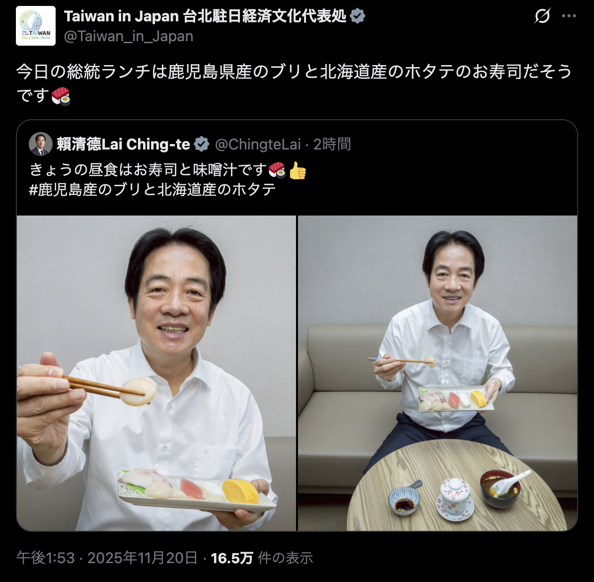 | … | 155無念Nameとしあき25/11/20(木)17:14:25No.1367455442+台湾総統「お寿司おいしいです」 |
