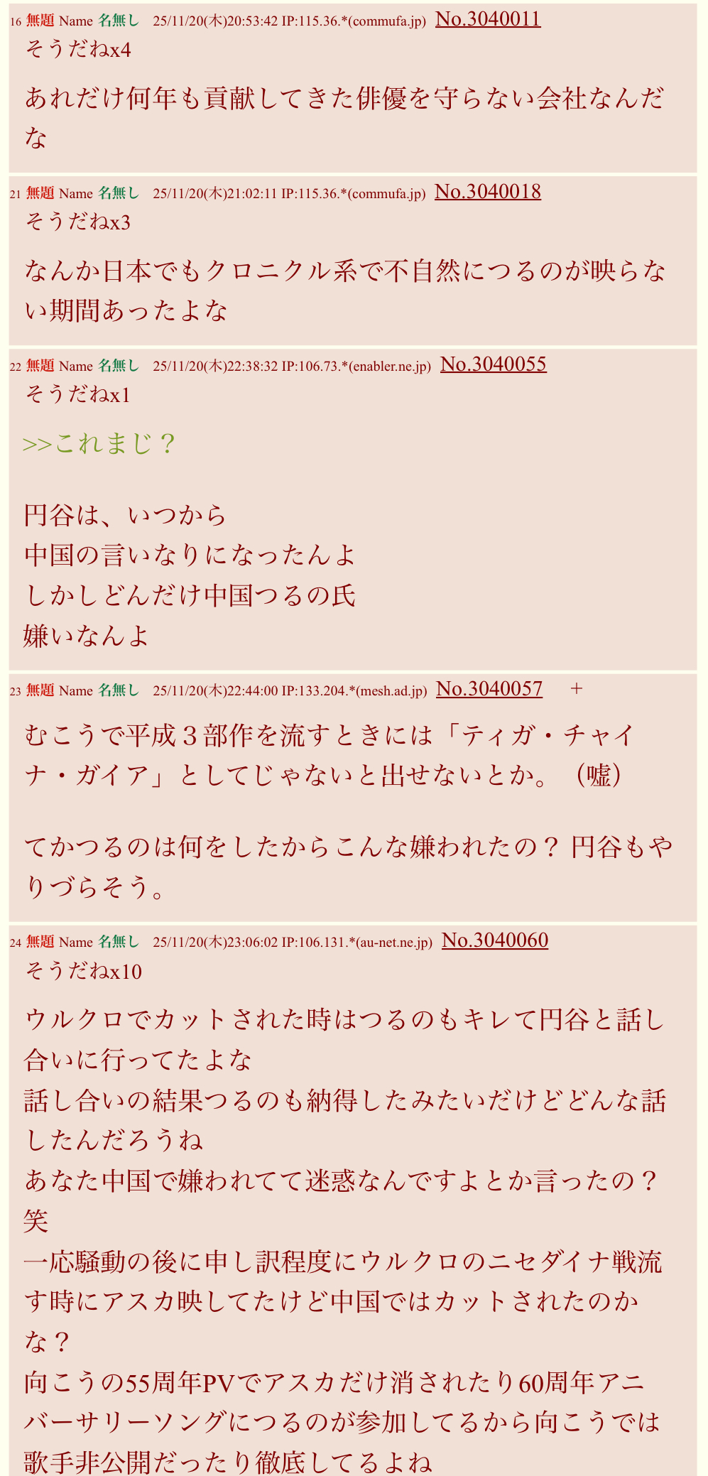 | … | 113無念Nameとしあき25/11/21(金)01:47:41No.1367567920+中国に対して差別的なこと言ったり称賛したりするダブスタレイシストの雑魚粘着くんは最低だねってスレ |