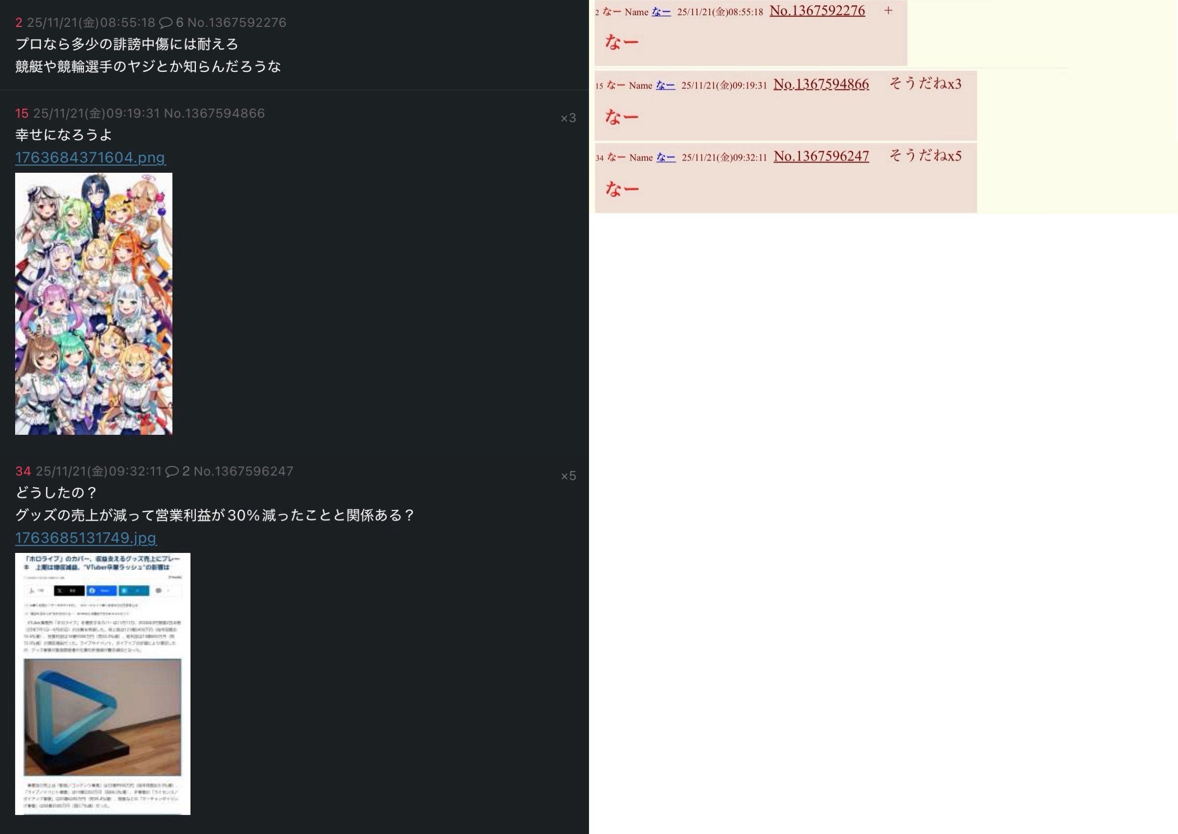 | … | 76無念Nameとしあき25/11/21(金)10:04:44No.1367600113+ 1763687084473.jpg-(15910 B) >カバー株式会社:誹謗中傷犯は法的に処す |