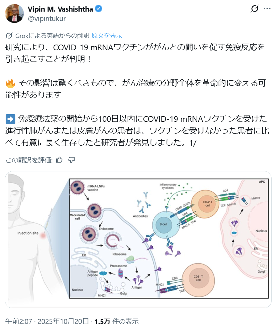 | … | 16無念Nameとしあき25/11/21(金)23:38:45No.1367768791そうだねx3 1763735925133.png-(455294 B) mRNAタイプの新型コロナ向けのワクチン打つと癌免疫療法の効果がアップするオマケが付いてくるぞ! |