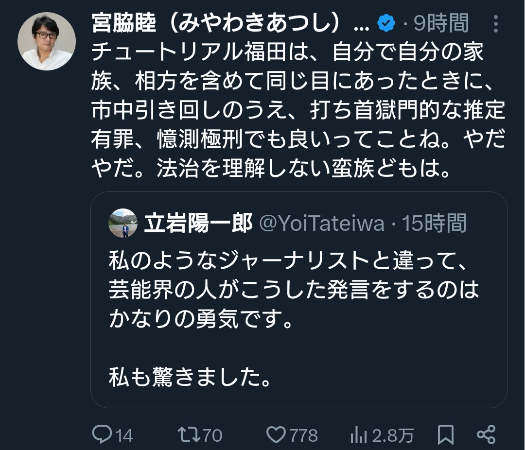 | … | 46無念Nameとしあき25/11/22(土)12:44:52No.1367861463+>>チュートリアル福田「斎藤知事は自分の支持者しか見ていない 自分に都合の悪い事には目を逸らしている」 |