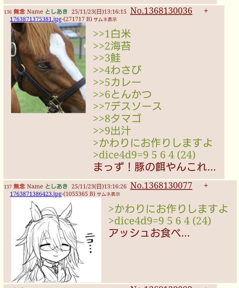 | … | 50無念Nameとしあき25/11/23(日)13:04:17No.1368127132+ 1763870657208.jpg-(121962 B) >としちゃんお昼ごはんよ〜 |