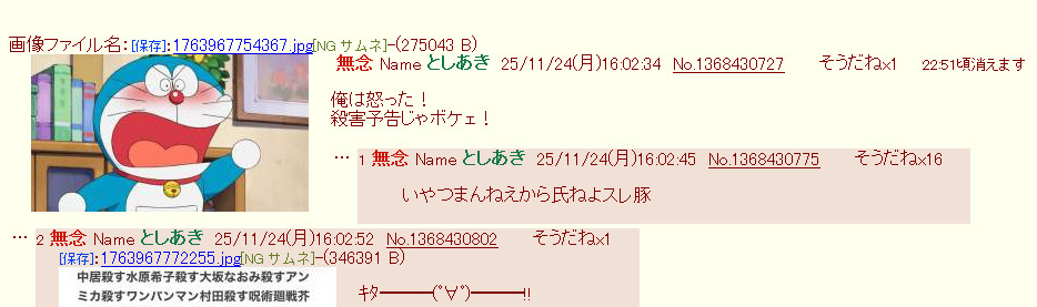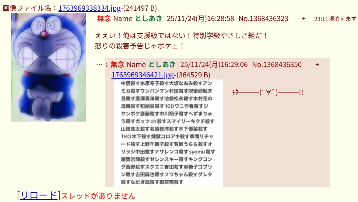 | … | 20無念Nameとしあき25/11/24(月)16:29:07No.1368436353+>> 楽しいな殺害予告は楽しいな |