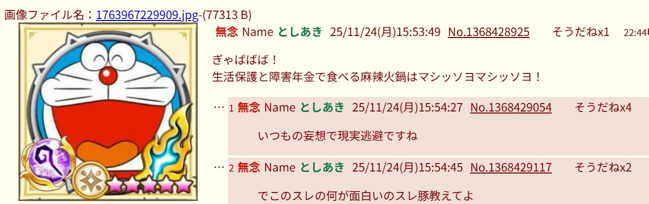 | … | 73無念Nameとしあき25/11/24(月)17:46:32No.1368452884+さっきから自分で支援級スクショでスレ立てては消してるが |