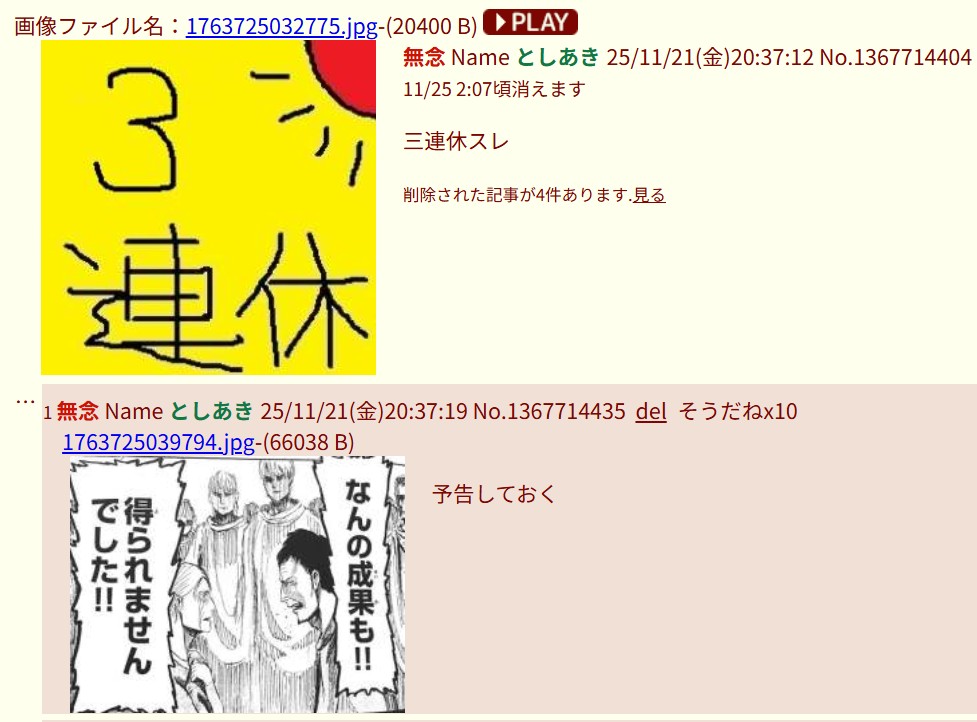 | … | 27無念Nameとしあき25/11/24(月)16:33:58No.1368437291そうだねx1次のスレは消して逃げたね |