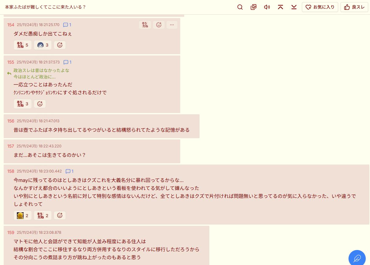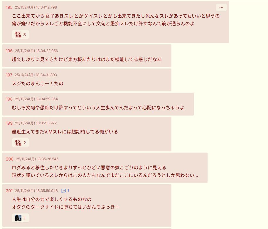 | … | 47無念Nameとしあき25/11/24(月)18:31:53No.1368463785そうだねx2>結局承認制以外普通に会話できる場所なんてムリなんだっての |