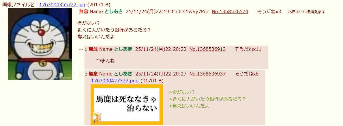 | … | 12無念Nameとしあき25/11/24(月)22:23:37No.1368537892そうだねx4銀行強盗の予告か |