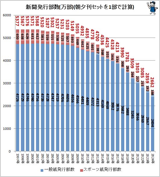 | … | 26無念Nameとしあき25/11/25(火)02:07:08No.1368578235+アサヒ読売日経あたりは公共施設やホテルや病院なんかに無理矢理取らせてるから部数は減らしてもしばらくは安泰じゃないかな… |