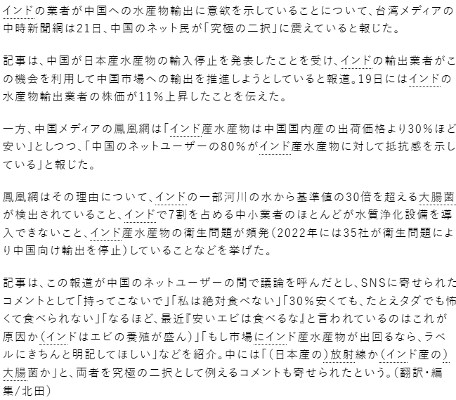 | … | 95無念Nameとしあき25/11/26(水)01:44:00No.1368795352+中国人ならガンジズの元で育ったインド産水産物で十分だろ |
