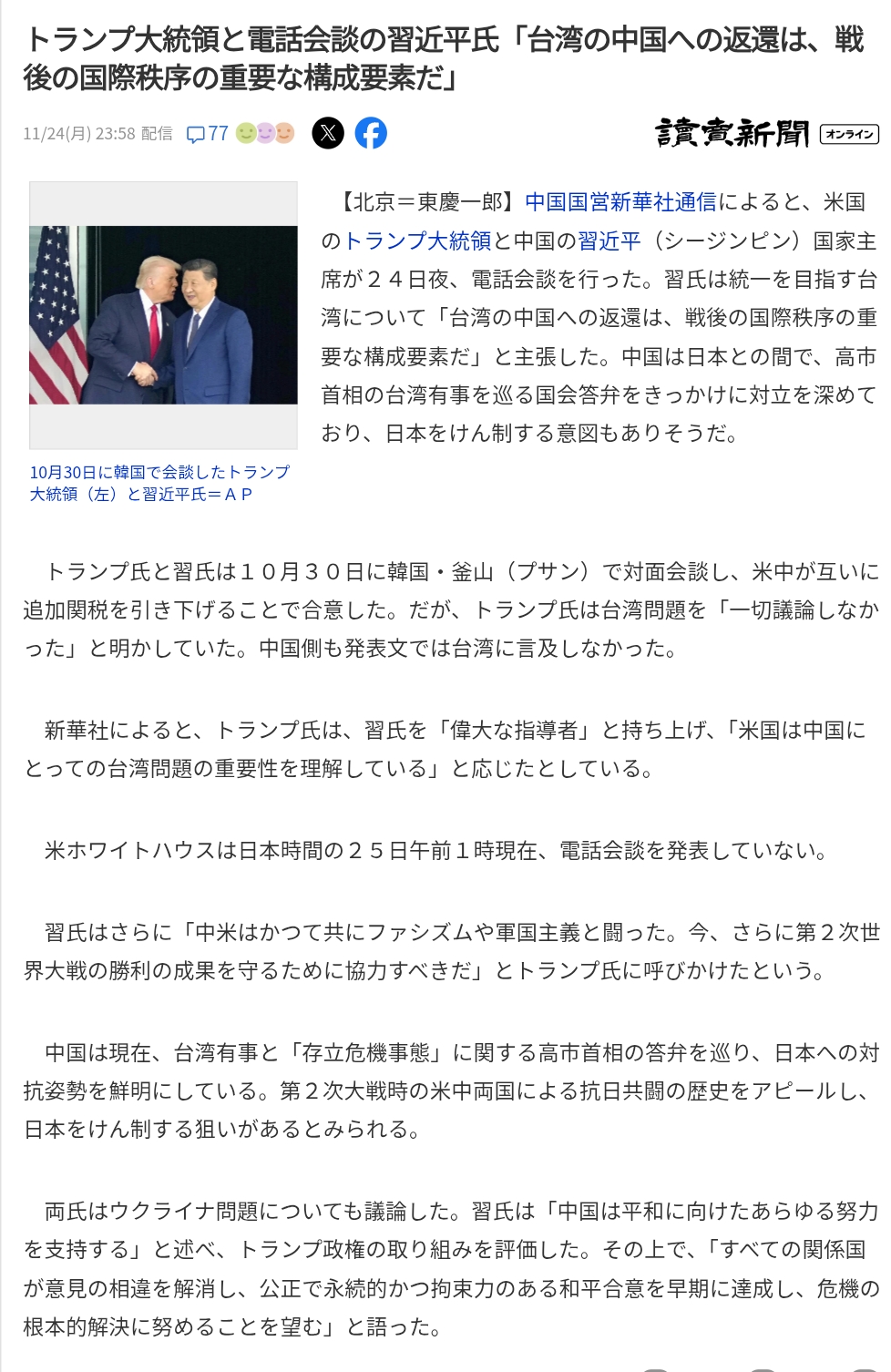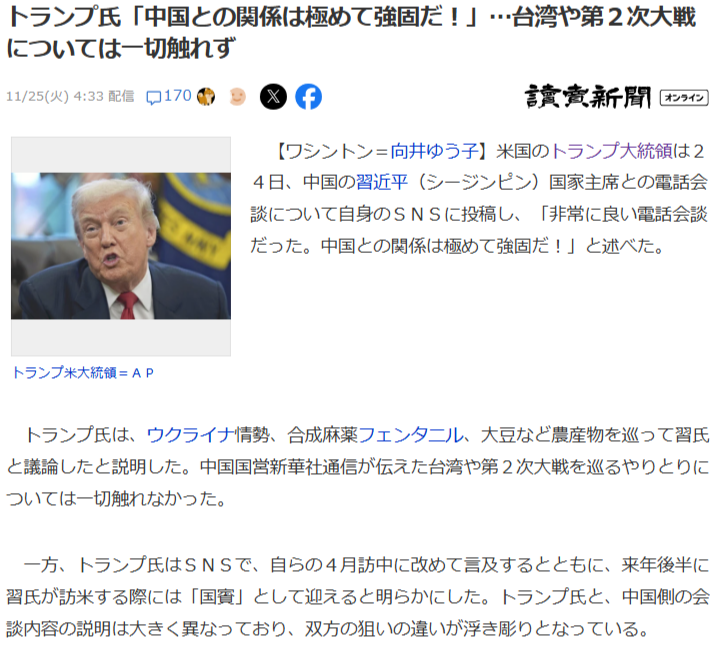| … | 975無念Nameとしあき25/11/26(水)08:28:40No.1368817486+けど中国の女報道官は良い電話会談だったとか言ってたし |
