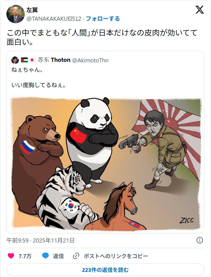 | … | 94無念Nameとしあき25/11/26(水)01:43:58No.1368795349そうだねx3高市の発言にキレるってのは日本とアメリカが協力関係にあることが問題だと言ってるって |