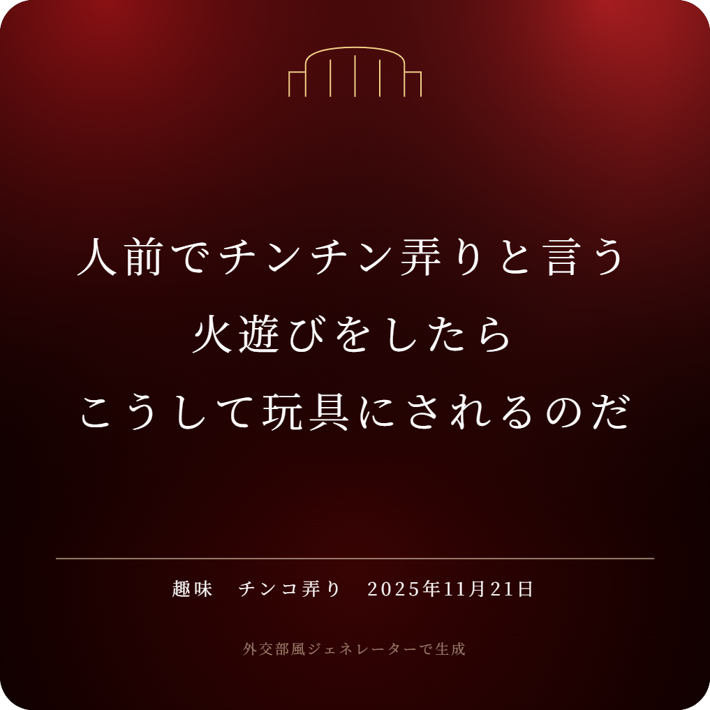 | … | 47無念Nameとしあき25/11/26(水)01:28:08No.1368793590そうだねx13日本人は工作員とかですらない民間人がただ総領事をおちょくっているだけなのに勝手に本国が死んでいく… |