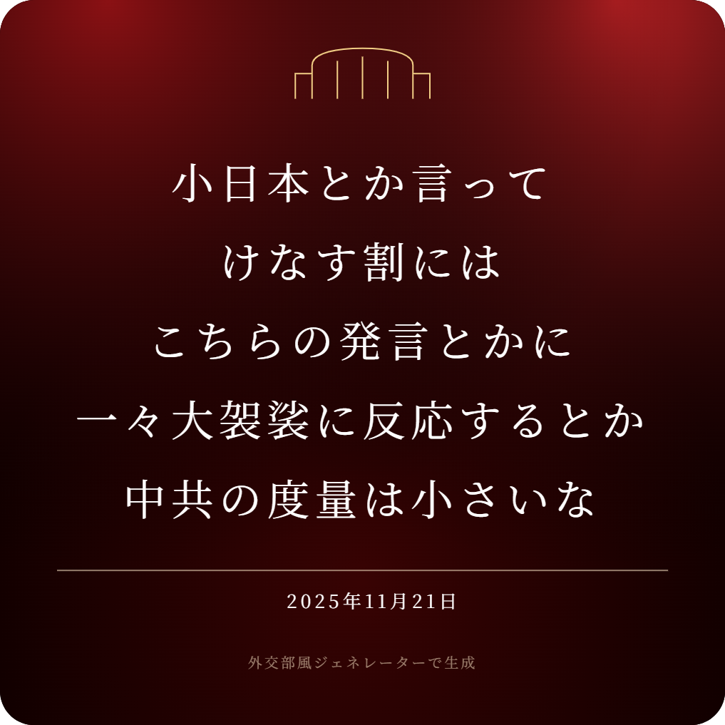 | … | 995無念Nameとしあき25/11/26(水)08:34:28No.1368818106そうだねx3>だいたい一領事が一国の長に予告なく暴言を投げつけた時点で中国の面子丸潰れと言うのは棚上げしてる問題 |