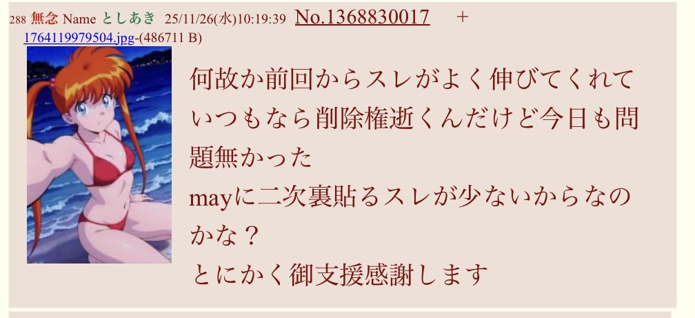 | … | 10無念Nameとしあき25/11/26(水)07:45:11No.1368813085そうだねx8支援者ってもしかして削除RTAやってる? |