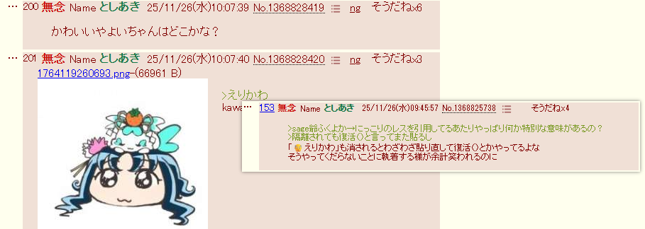 | … | 36無念Nameとしあき25/11/26(水)08:04:05No.1368814848そうだねx3実際先に貼られても拡張子やサイズ変えて貼って常同行動しようとするなんなんだろうな |