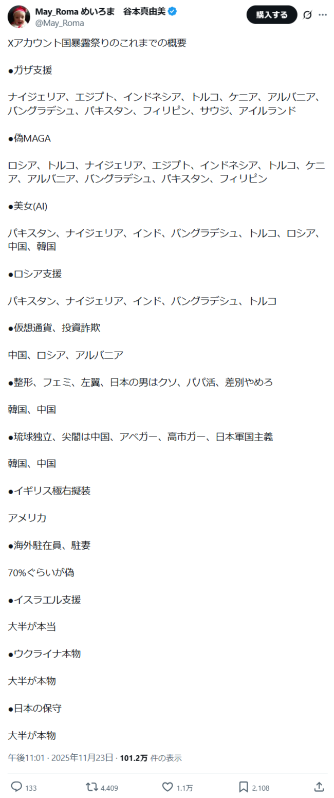 | … | 86無念Nameとしあき25/11/26(水)11:20:32No.1368838122+>元々ニューヨーク市長選でXでニューヨーク市民成りすました他国のイスラム教徒の情報工作で負けたって分析で国表記導入されたから |