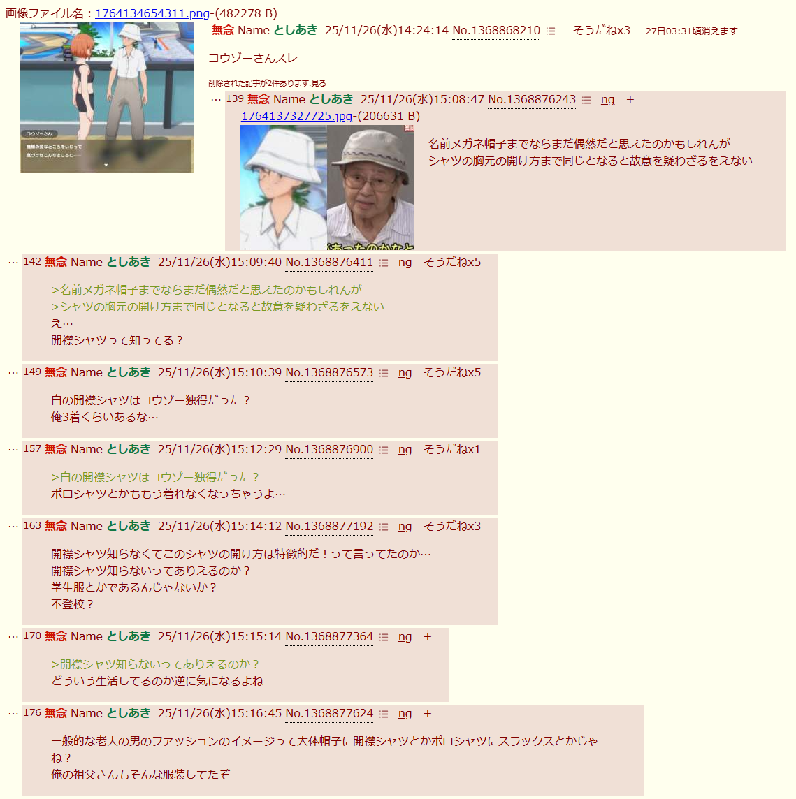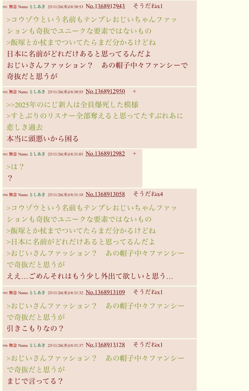 | … | 62無念Nameとしあき25/11/26(水)18:08:20No.1368907481そうだねx4勝ち誇るも何も開襟シャツ知らないってどういうことだよ |