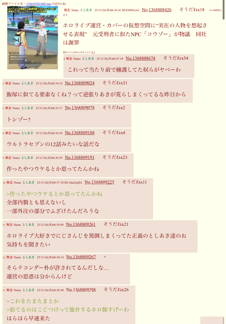 | … | 26無念Nameとしあき25/11/26(水)17:28:20No.1368899480そうだねx18>これを偶然と言い張れるならホロライブへの誹謗中傷も全部「悪口言ったのが偶然同じ名前の人だった」で言い逃れできるんじゃねぇの!? |