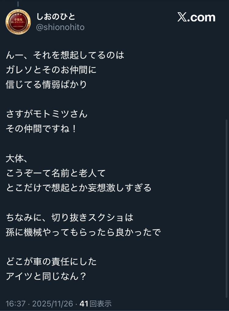 | … | 104無念Nameとしあき25/11/26(水)19:40:24No.1368931812そうだねx4 1764153624901.jpg-(1184509 B) 暴れてる連中のソース貼ろうか? |