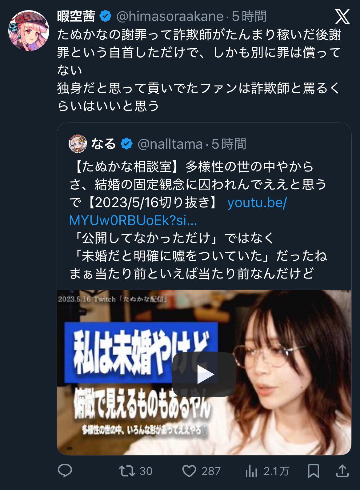 | … | 290無念Nameとしあき25/11/26(水)19:12:09No.1368923955+暇空さんが独身なのは知ってるよ |