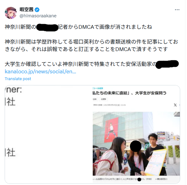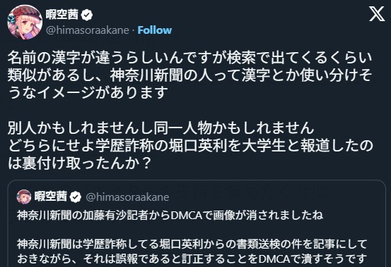 | … | 324無念Nameとしあき25/11/26(水)19:30:46No.1368928989+>いや暇空が「あいつは学歴詐称してた」って主張してる堀口のことを神奈川新聞が大学生って書いたことにキレた |