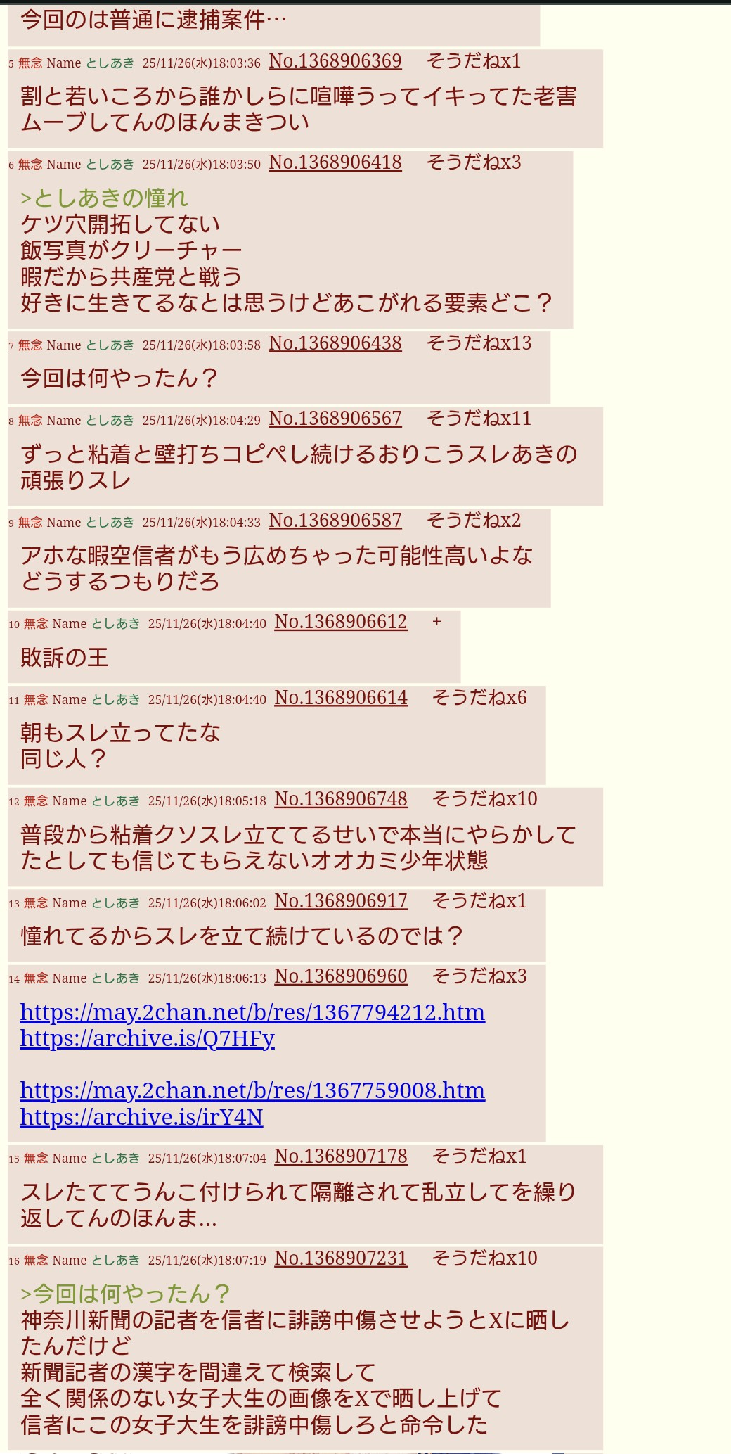 | … | 330無念Nameとしあき25/11/26(水)19:32:39No.1368929525+>>いや暇空が「あいつは学歴詐称してた」って主張してる堀口のことを神奈川新聞が大学生って書いたことにキレた |