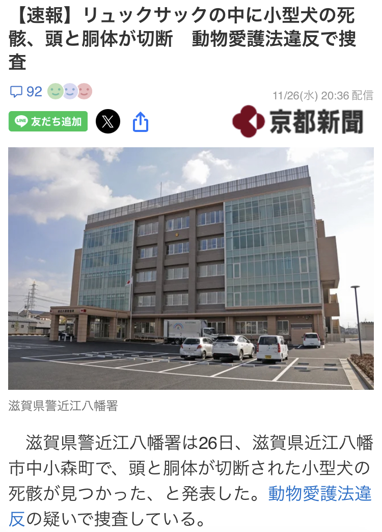 滋賀で頭と胴体が切り離された犬の死体が見つかる