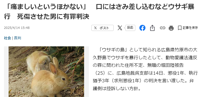 | … | 3無念Nameとしあき25/11/27(木)02:33:03No.1369021096そうだねx6なんか前に滋賀の大学生がどっかの島でうさぎ殺してなかった? |