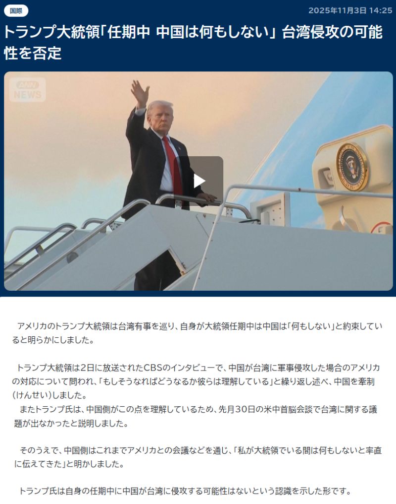 | … | 924無念Nameとしあき25/11/28(金)06:31:11No.1369251168そうだねx4 1764279071949.jpg-(109249 B) >>ウクライナの件といいトランプがノーベル賞欲しさに台湾捨てそうな不信感があるんだけど |