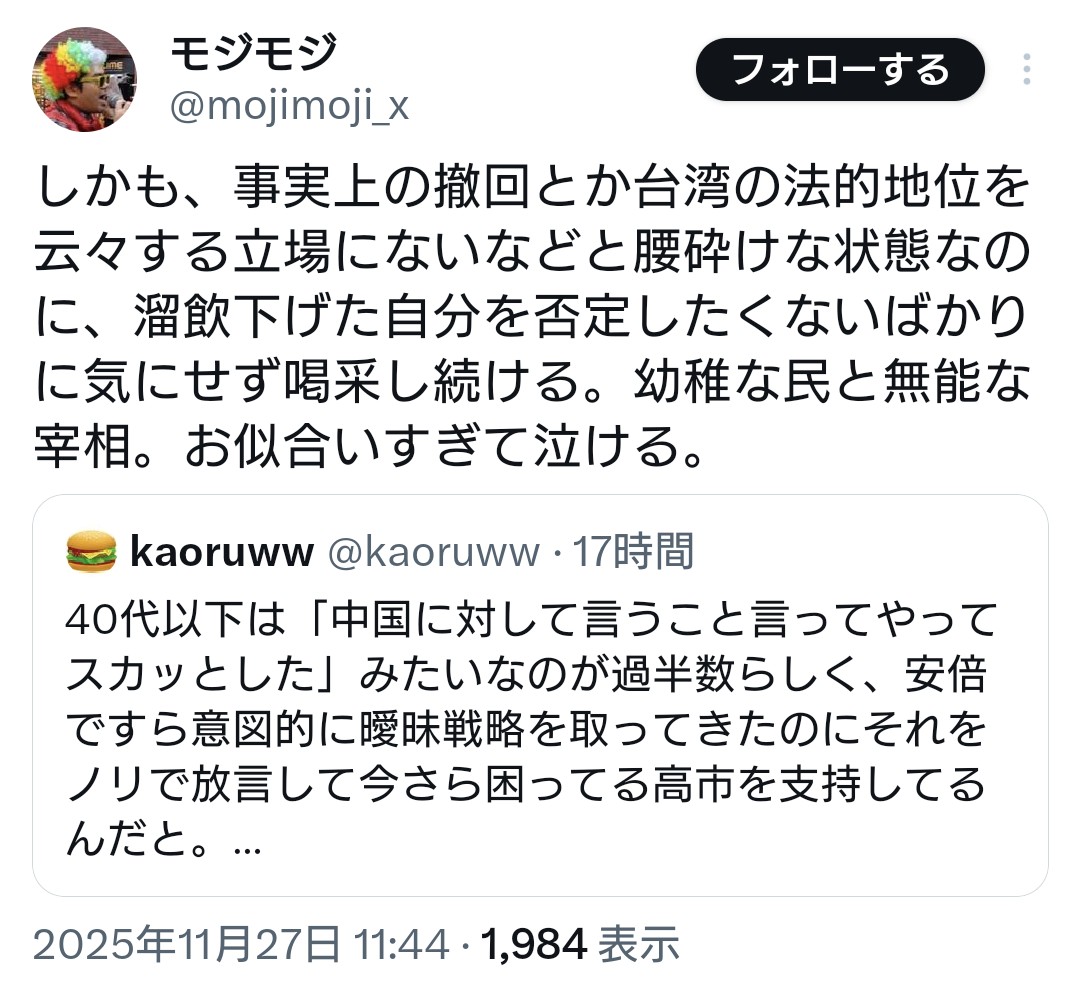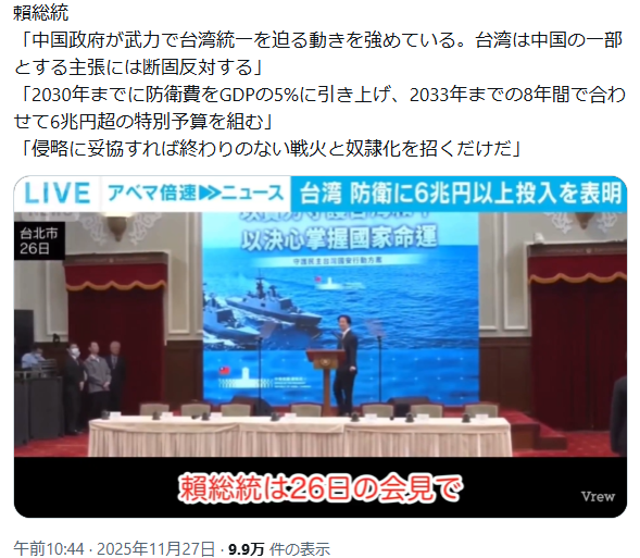 | … | 984無念Nameとしあき25/11/28(金)07:49:11No.1369256286+台湾が直々に中国から侵略行為を受けていると言う声明出したけど |