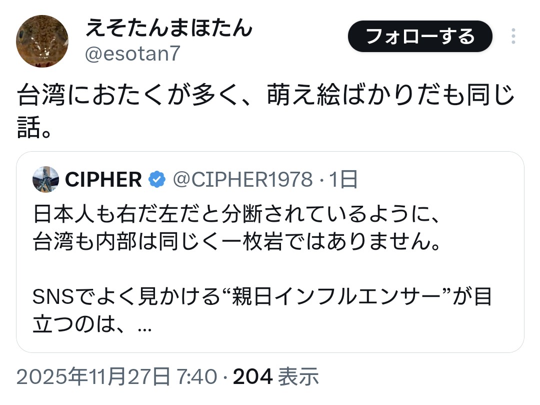 | … | 74無念Nameとしあき25/11/28(金)00:48:52No.1369231336そうだねx11なんか言動が武力による台湾支配を隠さないやつばかりなんだけど |