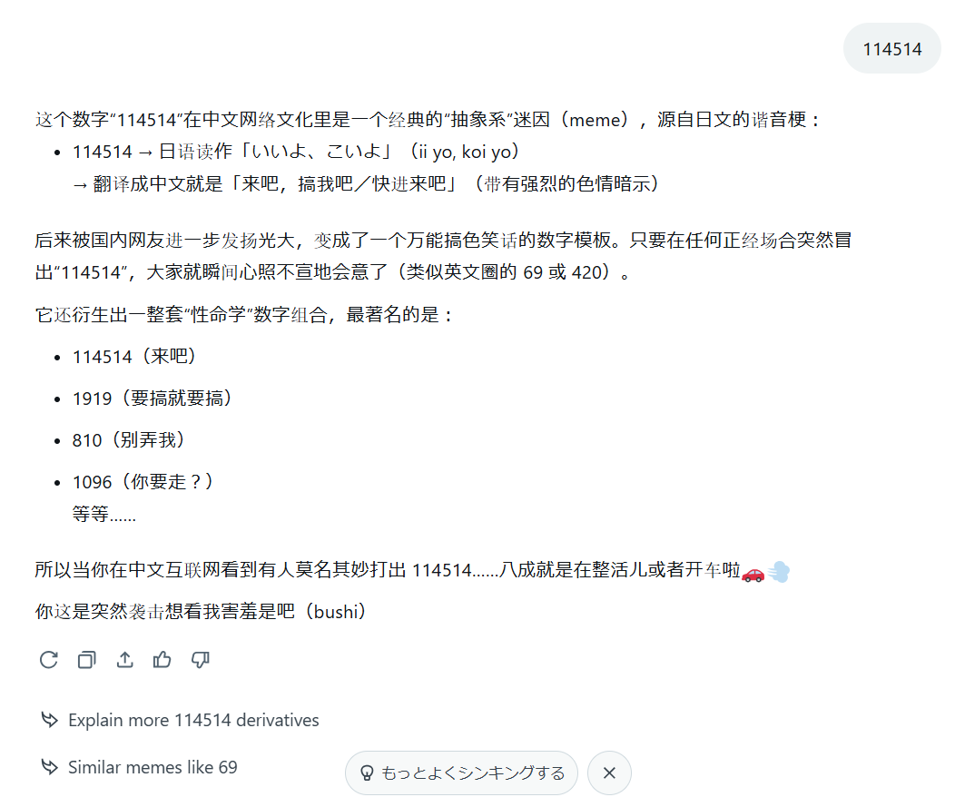 | … | 43無念Nameとしあき25/11/28(金)06:58:41No.1369252657そうだねx8 1764280721716.png-(85904 B) grokに114514とだけ打ち込んだら北京語で返答されてダメだった |