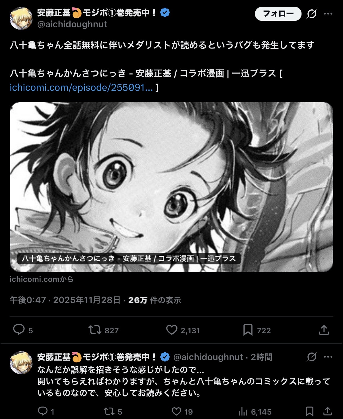 | … | 27無念Nameとしあき25/11/28(金)22:37:45No.1369419903+作者が「終盤をようやく客観視できるようになった」なんて意味深なポストをしてるけどなんかあったんかな |